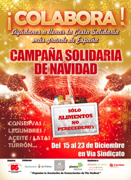 Como el pasado año, desde la Asociación de Comerciantes de Via Sindicat volvemos a organizar una Campaña Solidaria de Navidad para la recogida de alimentos no perecederos para Cáritas Mallorca y Aliments en Xarxa, con objeto de que puedan destinar estos alimentos a la preparación de las cenas y comidas de Navidad en distintos comedores sociales de Palma y a cuantas familias les haga falta.